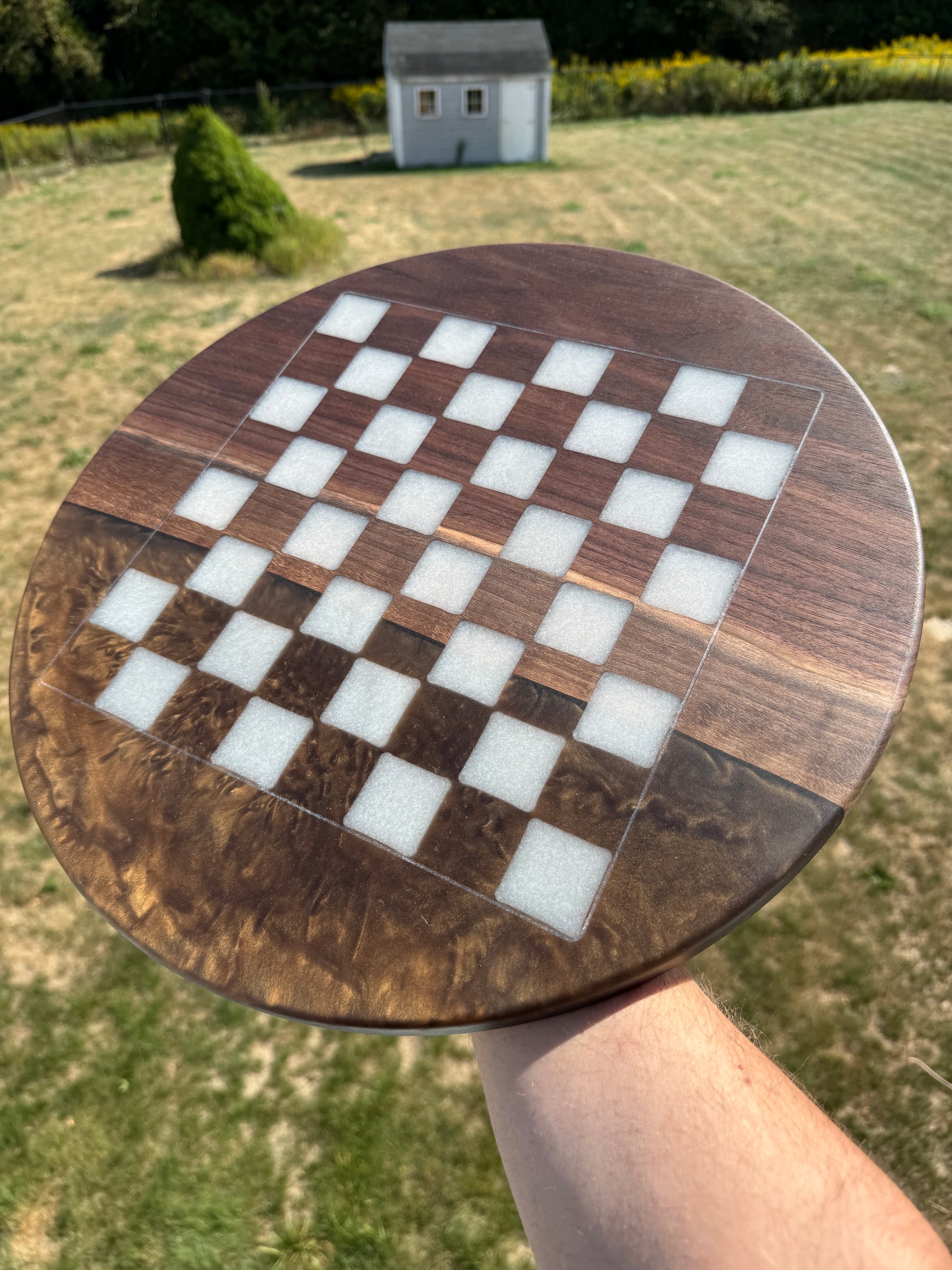 This handcrafted round chess board is made from a locally sourced walnut cookie paired with smoky grey epoxy resin. The 18" board features carved squares filled with shimmering pearl white resin, giving a striking contrast that’s both modern and classic.