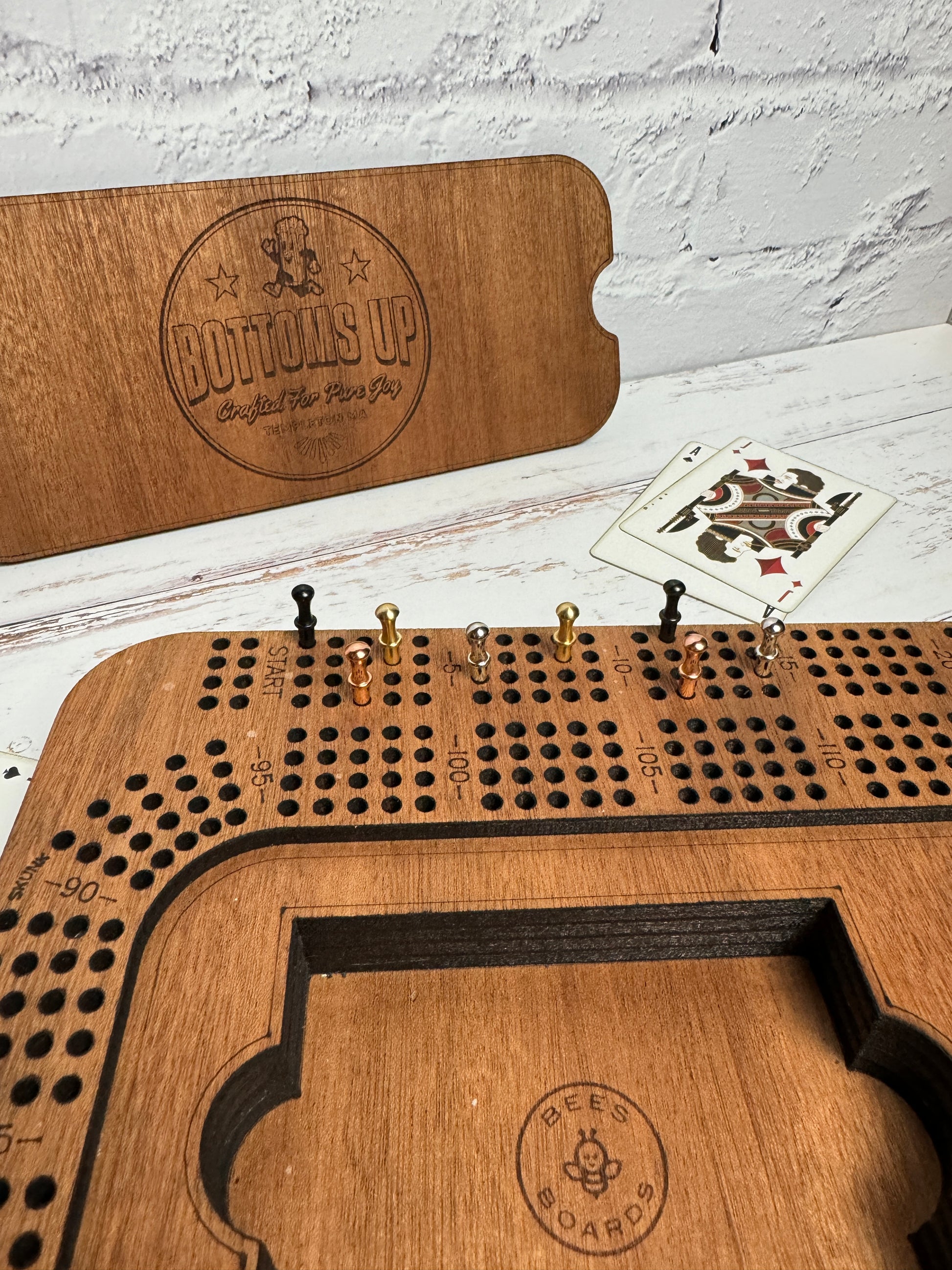 Each Cribbage board is hand crafted in our workshop. At around 12" by 9", these boards are precision cut with a laser, with a 4 track design, and include Skunk, Double Skunk, Start and Finish markers, along with a card suit design inside. Scoring tracks, peg storage and card storage are inside the board, and every one comes with a bag, pegs and brand new deck of Bicycle cards.