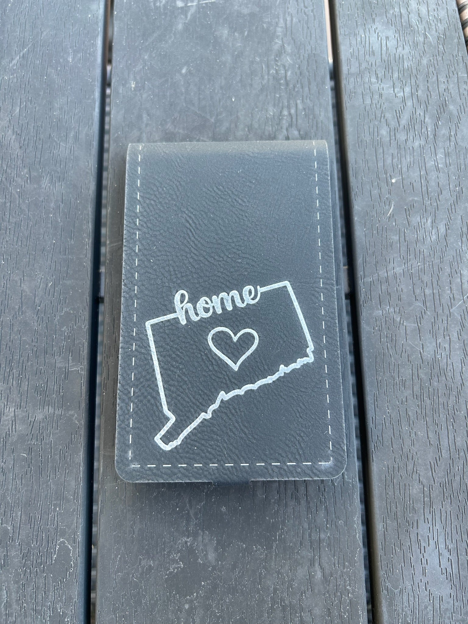 Wrapped in vintage brown leatherette and featuring a crisp outline of Connecticut with the word “Home” stamped in, this board is both portable and personal. Inside, it’s built from real cherry and maple hardwood veneers and are a 60 peg, two player layout. Each player goes down and back to the finish spot. We include numbers and markers to keep everyone on track.
