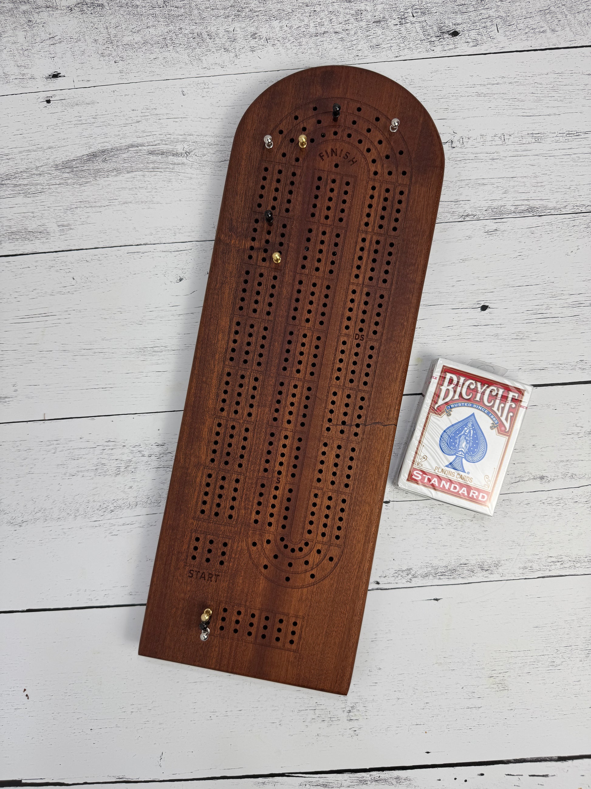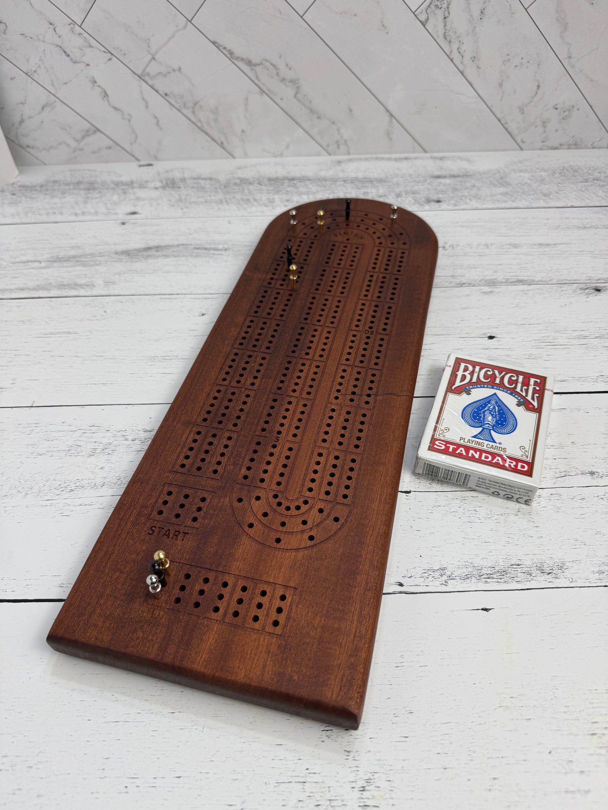 Handcrafted solid sapele cribbage boards, made from premium hardwood in our workshop. Perfect for game nights or gifting!